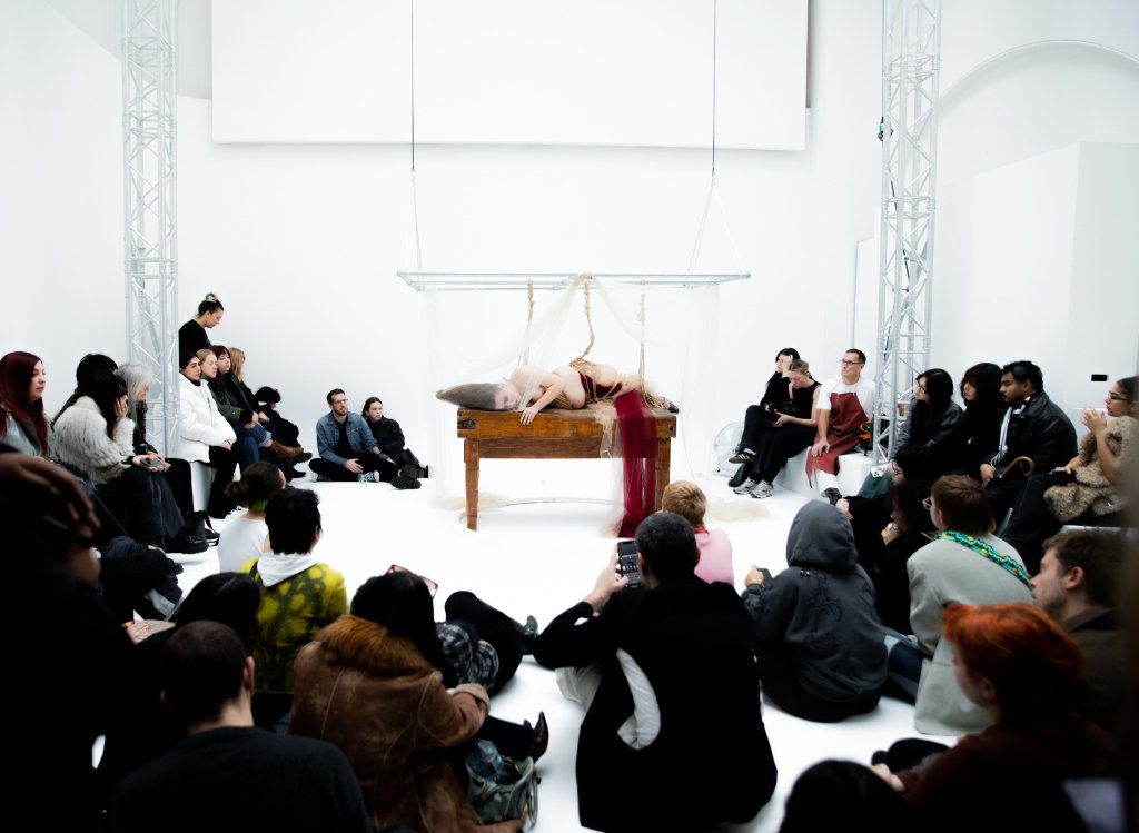 In this 3 hour-long performance, Stark was suspended from SHOWstudio’s ceiling by mounds of tulle, presenting an even more ambitious take on her hauntingly beautiful Tate Modern performance.